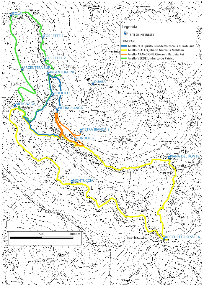 Artignaga (1385 m) - Argentera superiore (1540 m) - Isolà (1535 m) - Torrette 1 (1413 m) - Torrette 3 (1355 m) - Argentera inferiore (1405 m) - Opificio in riva destra Sessera (1274 m, interscambio con Anello Robilant) - Artignaga (1385 m)