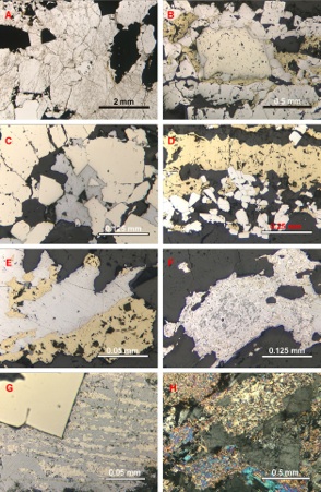 Sezioni sottili al microscopio di vene idrotermali contenenti pirite, calcopirite e galena e di rocce all’immediato contatto con le vene idrotermali.