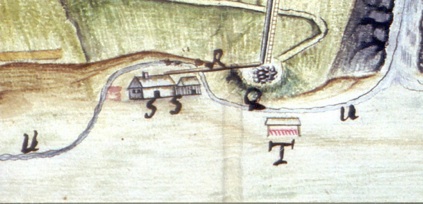 Stabilimento proto-industriale della val Sesia, probabilmente molto simile a quello di Piana del Ponte, in un disegno di J.N. Mühlhan (1725 circa, di Stato di Torino): Q = spiazzo di raccolta del minerale; R = via di carreggio; S = fonderia; T = forni di arrostimento; U = gora