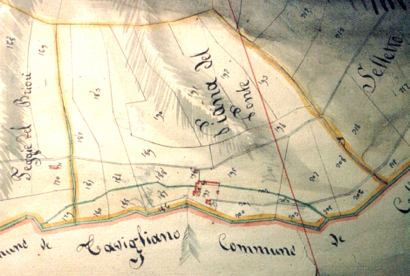 La zona di Piana del Ponte nel catasto di età napoleonica (1813, Archivio di Stato di Torino): la fonderia settecentesca è ormai trasformata in fucina